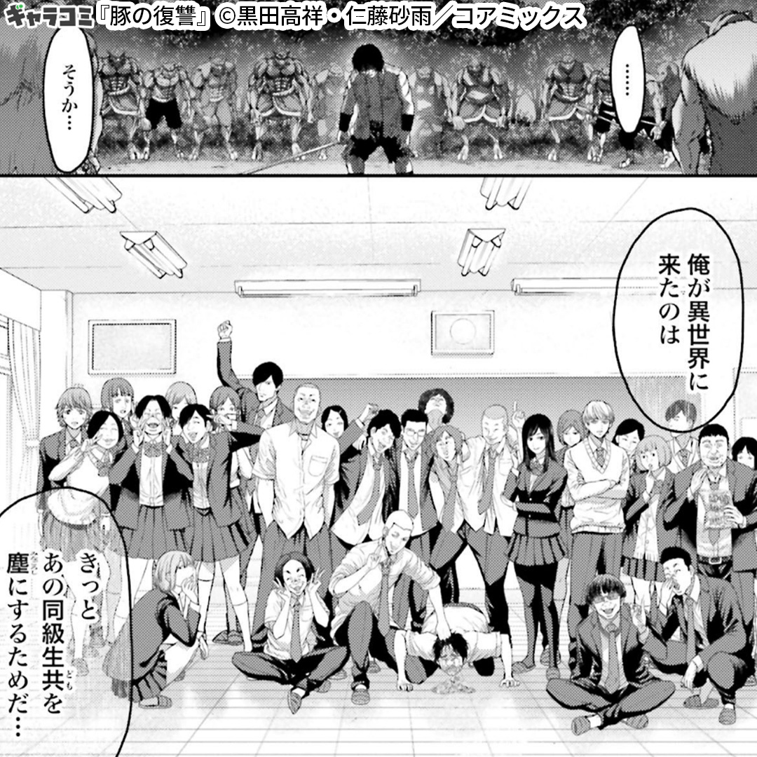 男はずっと、ずっと、ずっといじめられ続けてきた。いじめられ続けた理由はただ一つ「顔が豚に似ているから」。日々過酷さを増す絶望の中、偶然転移した異世界で掴んだ小さな幸せ。しかし、その幸せは同じく転移してきた同級生達に無残に踏みにじられる……。舞台は異世界ーー。今、ただ黙って虐げられ続けてきた男の復讐の物語が始まる。「俺を“豚”扱いしてイジメ続けてきた同級生(あくま)どもはーーひとり残らず鏖(みなごろし)だ。」